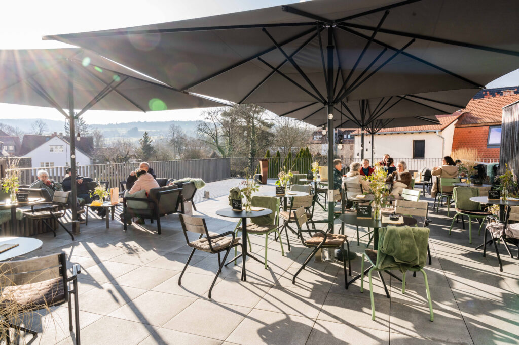 Die namensgebende Dachterrasse der Weinterrasse bietet weitere 57 Sitzplätze und lädt besonders an warmen Tagen zum Verweilen ein. Von hier genießen Sie eine entspannte Atmosphäre über den Dächern von Michelstadt.